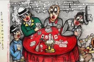 Другият цикъл е московски. „Гюзелев не е бил там, но оттам идва заплахата за свободата – не само на жертвите на руските ракети, но и на всеки европеец. Художникът е рисувал с ръката на заплашен европеец. С умело оркестрирано взаимодействие на сюрреализъм и експресионизъм той е явил в образи промитите мозъци, идеологическия кич, завърналото се минало, чезнещия смисъл, попарените надежди, усмивката на главорезите, болката на невинните, страха от бъдещето…“, коментира експертът.
