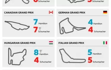 Както и генералните показатели, списъците със спечелени състезания на някои от класическите писти отчитат превъзходството на Хамилтън и Шумахер над останалите състезатели. Но има и някои интересни аномалии.