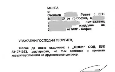 "Изложеното ми дава основание да твърдя, че г-н Стоимен Гешев, баща на Иван Гешев, е придобил дялове, съставляващи 2% от капитала на "Жоси" ООД за сумата от 100 лв., която не е ясно дали и как е заплатил", завършва Демерджиев и прилага копия на документите, които са налични и в партидата на дружеството в Търговския регистър.