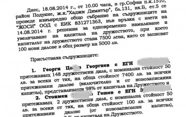 След като остава единствен съдружник, Георгиев намалява капитала на "Жоси" с 2500 лв. и едновременно с това увеличава капитала на дружеството с 5000 лв. чрез издаване на нови сто дяла с номинална стойност от по 50 лева всеки, от които 98 дяла са записани от Георги Ц. Георгиев, а 2 дяла – от Стоимен Гешев, за което е посочено последният да е внесъл сумата от 100 лв., пише още в отговора си Демерджиев.