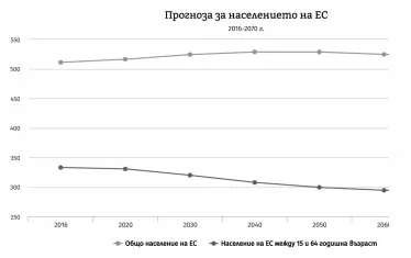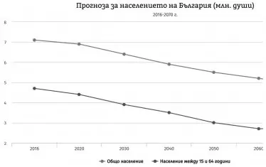 Прогнозите за България сочат, че голямата пречка пред икономическия растеж – прогнозиран да се забави до около 1% средногодишно след 2040 г., ще бъде значителното свиване на населението като цяло, както и конкретно на хората в трудоспособна възраст. Въпреки че според ЕК коефициентите на демографска зависимост в страната остават почти непроменени в дългосрочен план, номинално населението във всички възрастови групи ще се свива чувствително.