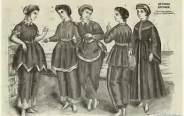 до китките на ръцете, под която има клин, покриващ глезените на краката. Тоалетът завършва с шапка. Иначе казано - викториански буркини, но с дантели. Да се появиш с по-лежерно облекло на плажа, се е смятало за крайно неприлично. Същественото е, че плажът вече не е същият - има дрескод, т.е. своя етика. Мъжкият бански костюм е малко по-разкрепостен. Представлява раирана фланела с къси ръкави и раиран панталон до коленете. Тази плажна мода и за двата пола се запазва почти до средата на миналия век.