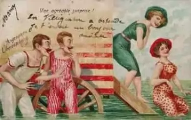 Нека видим как се е променял плажът. Как пясъчната ивица между брега и морето се превръща в особен вид социално пространство? Освен вилите, хотелите, казината и ресторантите в непосредсвена близост до брега става и нещо друго. На самия плаж се появяват т. нар. bathing machines. Това не са точно машини за къпане, а малки съблекални от плат или дърво на колела, в които дамите оставяли дневните си облекла, за да облекат плажни костюми. Дамският бански костюм от Викторианската епоха представлява