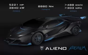 Неизвестната компания Alieno, чието седалище се намира в България, представи своята "хиперкола на бъдещето". Моделът се казва Arcanum (от латински "тайна"), като топверсията му ще развива мощност 5521 к.с. и 8880 Nm въртящ момент.