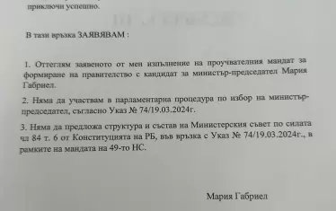 Според Габриел "координираният отказ от и нежелание за участие в кабинета Габриел-Денков на 11 министри от кабинета Денков-Габриел, чрез формулярни/бланкови заявления и липсата на съгласие по време на последвалите преговори, обезсмисля процедурата по избирането на министър-председател и състав на правителство. Така, на практика, развитието на конституционната процедура не може да приключи успешно".