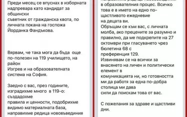"Обръщам се към вас с личната молба, ако прецените за разумно и правилно, да ме подкрепите", се казва в посланието на Стаматов, като дори посочва номерата на неговата бюлетина и на преференцията. Той вярвал, че в новото си поприще ще бъде по-полезен на училището и на образователната система в район "Изгрев". В обръщението си Стаматов, който повече от 10 години ръководи едно от най-големите училища в София, припомня нескромно свършеното - "създадохме правила и ценности, подобрихме видимо материалната база, направихме редица нововъведения в образователния процес".