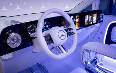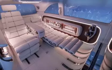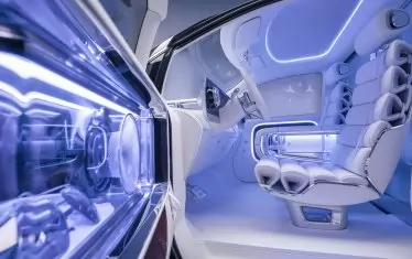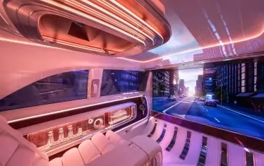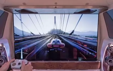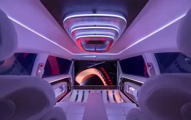 И това наистина проличама още при първия поглед на интериора. Арматурното табло разполага с панел с пълна ширина, включващ три различни цифрови екрана. Но истинската технологична витрина е отзад, където пътниците имат на разположение 65-инчов киноекран, който се издига от пода, когато хората се качват на борда. 4k дисплеят е подкрепен от 42 високоговорителя, а седемте проектора дори може да използват прозорците като допълнителни прожекционни повърхности за завладяващо 360-градусово изживяване при гледане.