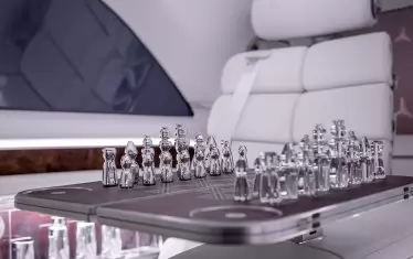 Два футуристични шезлонга от кристално бяла кожа Nappa и коприна може да бъдат напълно наклонени за ободряваща дрямка в напрегнат работен ден, а за отпускане с умствена дейност, вместо с видеоигрите на борда, сгъваемата маса се превръща в шахматна дъска.
