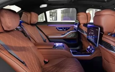 Новата S-Class също така е със завиващи на 4, 5 или 10 градуса задни колела, както и с фронтални въздушни възглавници за пасажерите отзад. За модела ще се предлагат система за допълнена реалност с проекционен дисплей, акустика Burmester (клас High-End), последна версия на система за контрол на комфорта Energizing, четиризонов климатик, развлекателна система за задните седалки с два 11,6-инчови сензорни екрана, камера full-HD и микрофон.