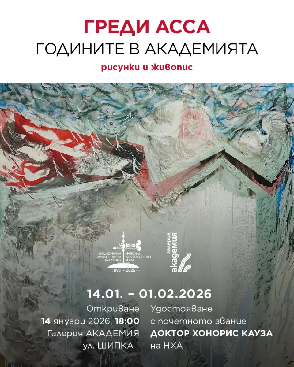 На 14 януари, сряда, от 18:00 часа в галерия "Академия" ще се състои тържествена церемония по удостояване на проф. Греди Асса с почетното звание "Доктор хонорис кауза" на Националната художествена академия. То се присъжда за изключителните му заслуги на преподавател в Академията, за неговия значим принос за развитието и достойното представяне на съвременното визуално изкуство в България и чужбина.