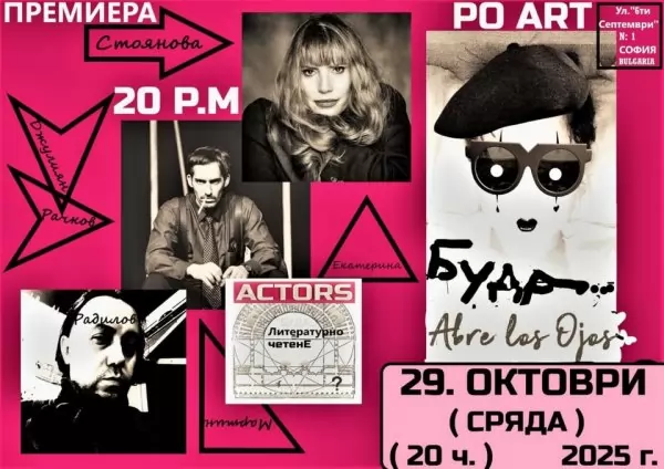 На 29 октомври от 20.00 часа ще има актьорско литературно четене на пиесата "Буда, какво ти е на очите?" от актьора драматург Мартин Радилов. Това е дълбока изповед на Иан Фелинг – отчаян журналист на свободна практика в Лондон, попаднал в задънена улица от несполучливи решения и провали. Дали, срещайки се с Буда, Иан ще успее да се промени? Дали Буда би го приел изобщо в своя храм? И ако това се случи, ще отвори ли Буда камениите си клепачи, за да помогне на Иан?... В четенето на маса на драматичната пиеса участват авторът Мартин Радилов и колегите му Екатерина Стоянова и Юлиян Рачков. Тримата актьори се превъплащават в различни роли – главния персонаж и второстепенните герои. От екипа обещават час смях, след който зрителят ще си даде сметка, че няма нищо смешно, а посланието "Стигнах твърде далеч…" ще отеква дълго след края на спектакъла.