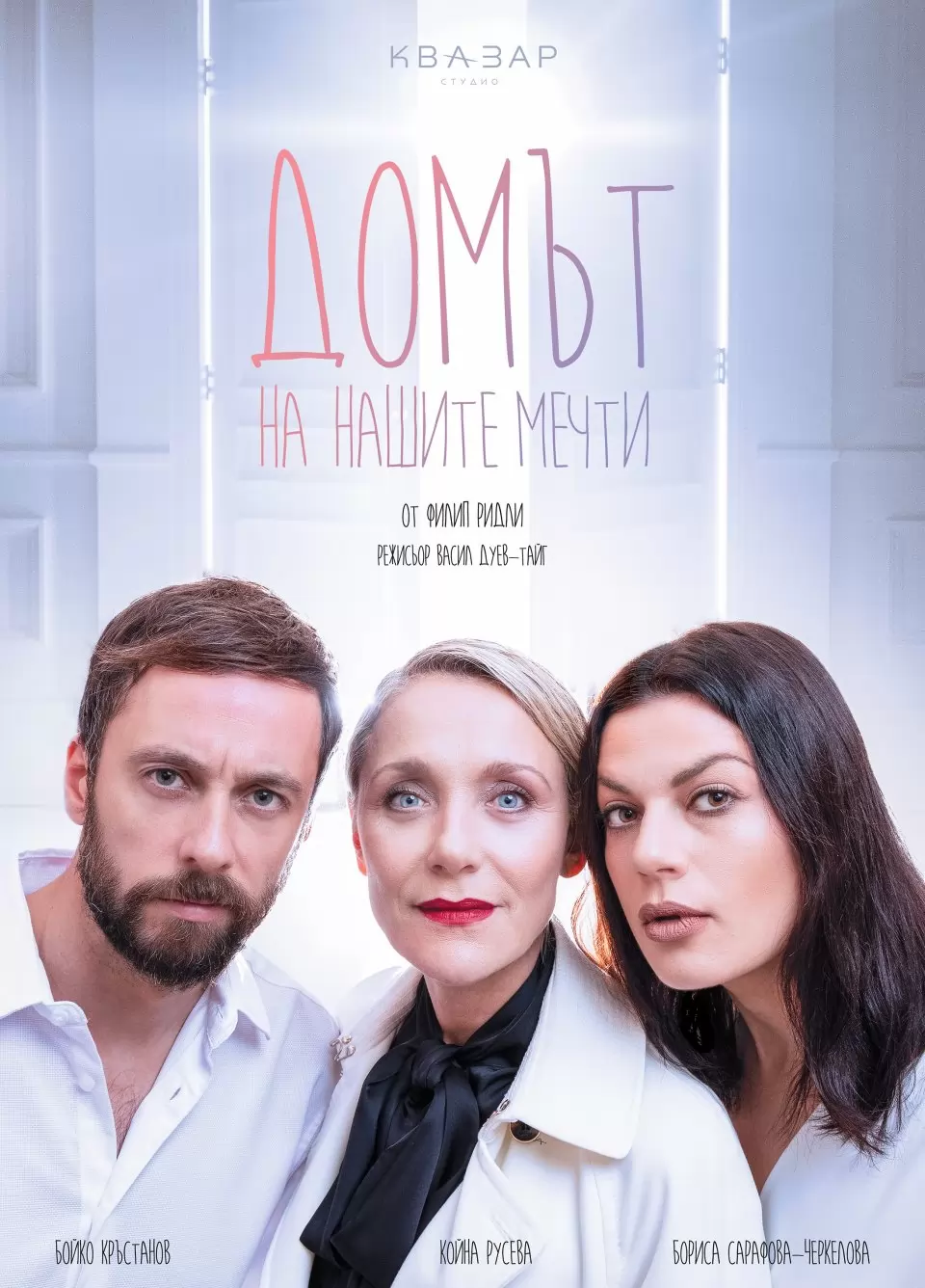 Провокативната черна комедия „Домът на нашите мечти“ от Филип Ридли с участието на Койна Русева, Бойко Кръстанов и Бориса Сарафова-Черкелова ще има премиера на 15 декември в „Театро отсам канала“. Това е най-новото заглавие, което предлагат продуцентите „Квазар студио“, а режисьор на спектакъла е Васил Дуев-Тайг. Автор на сценографията и костюмите е Даниела Николчова, композитор на музиката е Явор Намлиев, а хореографията е дело на Филип Миланов.