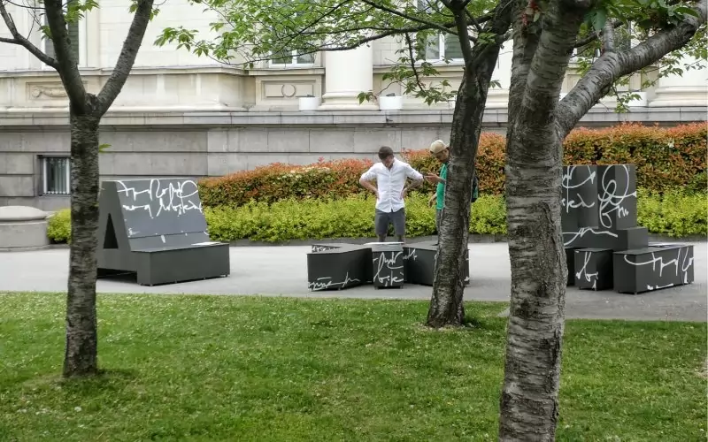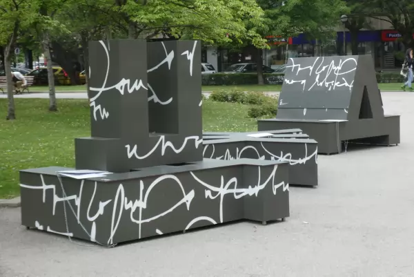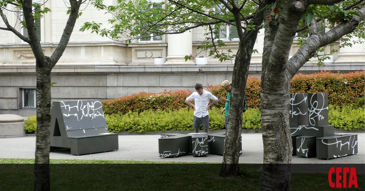 Д, Ж, Ц, Щ - от снощи тези 4 новоизработени „букви под прикритие“ (на пейки) се намират пред Националната библиотека „Св. св. Кирил и Методий“. Като пейка удобна е само Д, но и четирите вършат идеална работа, ако решите да седнете за малко, колкото да прочетете прикрипените към тях с верижки стихове на съвременни български поети.