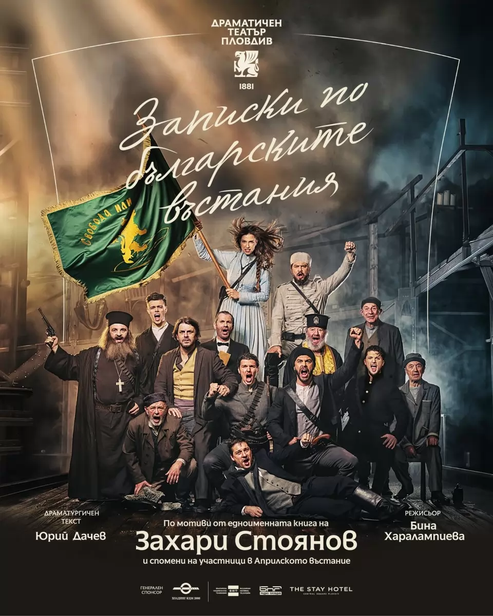 Тази вечер в Голямата зала на Драматичен театър – Пловдив, ще се състои премиерата на спектакъла „Записки по българските въстания“ по мотиви от едноименната книга на Захарий Стоянов. Постановката е посветена на 150-годишнината от Априлското въстание и в нея са включени и спомени на участници в него. Драматургичният текст е на Юрий Дачев, режисьор е Бина Харалампиева. Това е поредният опус на именития творчески тандем по произведения, увековечаващи големите събития в българската история. Сценографията и костюмите са дело на Свила Величкова, а композитор е Асен Аврамов.