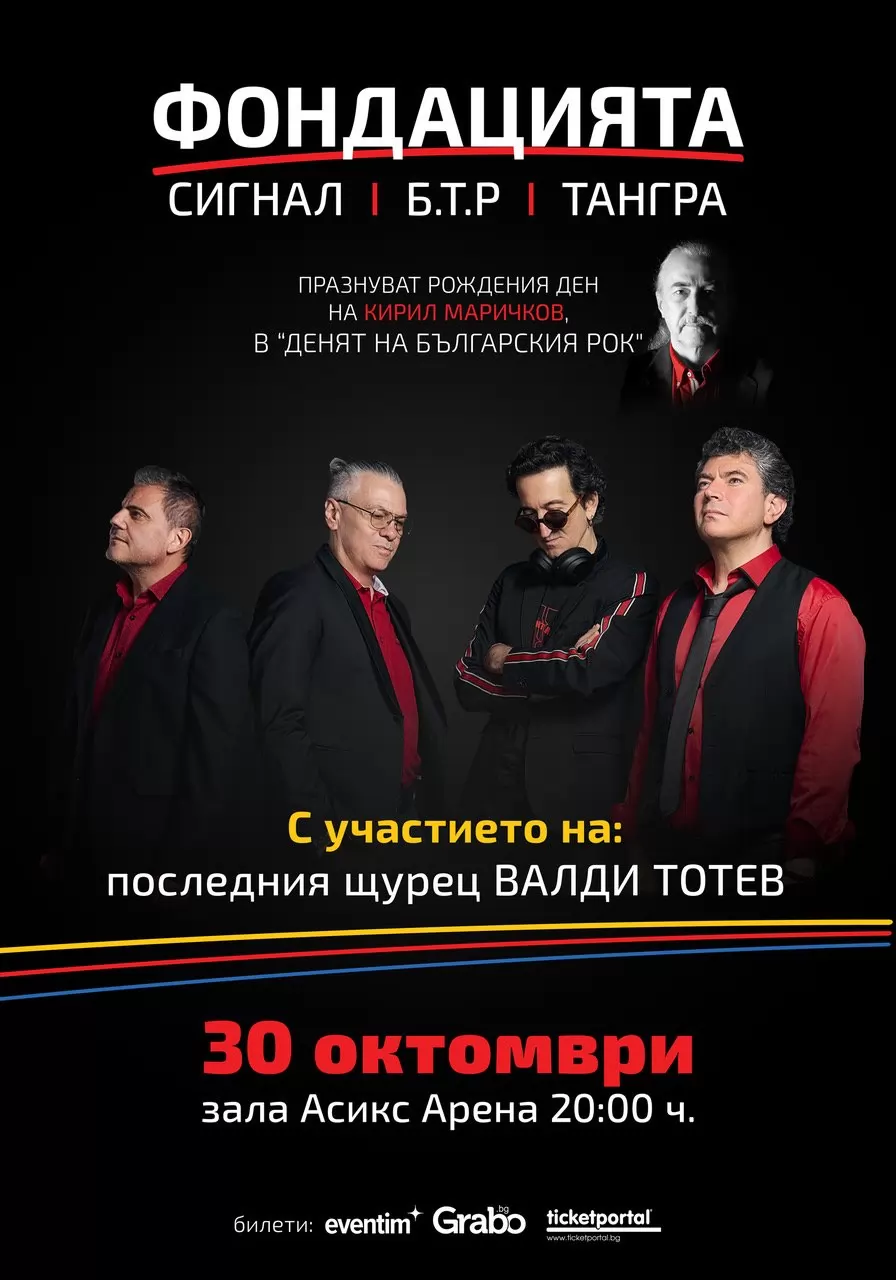 Кирил Маричков - легендарна фигура на българския XX век, музикант, демократ, потомък на забележителен род, почина на 11 октомври м.г., след като падна от сцената в село Селановци преди концерт на "Фондацията". В последното десетилетие Маричков бе част от гръбнака на групата. Той си отиде 20 дни преди да навърши 80, като до последния момент планираше голям концерт по случай юбилея. Роден е на 30 октомври 1944 г. Започва кариерата си през 1962 г. с „Бъндараците“ - една от групите-пионери на българския рок. Следват 40 години с "Щурците" и рекордните над 2600 концерта, многобройни албуми и турнета. Автор е на повече от 150 песни, а хитове като "Рок в минало време", "Вкусът на времето", "Конникът", "Клетва", "Хамлет", "Зодия щурец" феновете му ще помнят винаги. Маричков стои и зад музиката на 14 филма, сред които "Вчера", "Адио Рио", "Дунав мост".