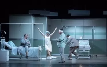 Задъханото действие, което протича в рамките на осем часа, е изцяло съсредоточено в една болнична стая. Сценографията, дело на Антония Попова, умело подсилва някои деликатно прокрадващи се внушения на драматуржката. Изневиделица, също като героите, зрителите се озовават в типичната нашенска държавна болница (поне до неотдавна). Положението ни е до болка познато - токът спира, персоналът не достига, а дежурният екип е зает ако не да спи, да се фокусира върху личните си проблеми. Така че на пациентите не им остава друго, освен взаимно да се обслужват, както могат. Маргарита Хлебарова, която ни е фаворит още от "Тъпи ентусиасти" на Теди Москов и Симон Шварц - другото премиерно заглавие в афиша на Сатирата, е неподражаема в ролята на медицинската сестра, съименница впрочем на актрисата. С ролки на главата, нахлуваща като стихия в стаята, ако въобще се весне да нагледа пациентите, тя има, разбира се, уважително оправдание за непрофесионалното си поведение. А именно - на другия ден й предстои да се омъжи. В ролята на четвъртия персонаж гледаме Петър Калчев, който прави заявка за театрална номинация. Една от любимите ни сцени е, когато под влияние на изпушения по погрешка джойнт халюцинира, че е щраус, и френетично размахва бинтованите си ръце.