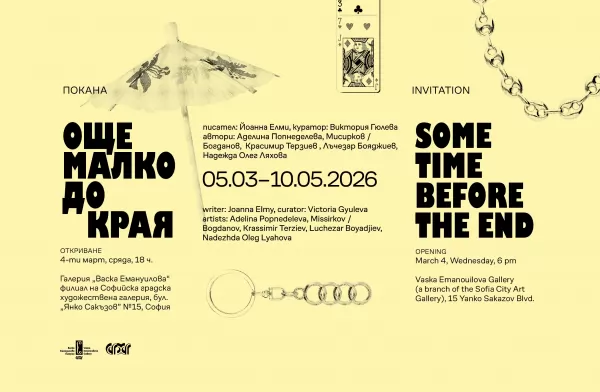 Изложба, наречена "Още малко до края", се открива утре, 4 март, от 18.00 часа в галерия "Васка Емануилова" – филиал на Софийската градска галерия на столичния бул. "Янко Сакъзов" 15. Експозицията събира работи на визуалните артисти Аделина Попнеделева, Борис Мисирков/Георги Богданов, Красимир Терзиев, Лъчезар Бояджиев и Надежда Олег Ляхова от колекцията на СГХГ и ги среща с нов разказ на Йоанна Елми, написан специално за проекта. Заглавието е заимствано от текста на писателката, който влиза в диалог с творбите и предлага различна рамка за преживяването им. Вдъхновен от произведенията, разказът е техен непосредствен литературен отзвук.