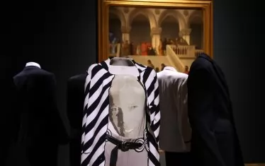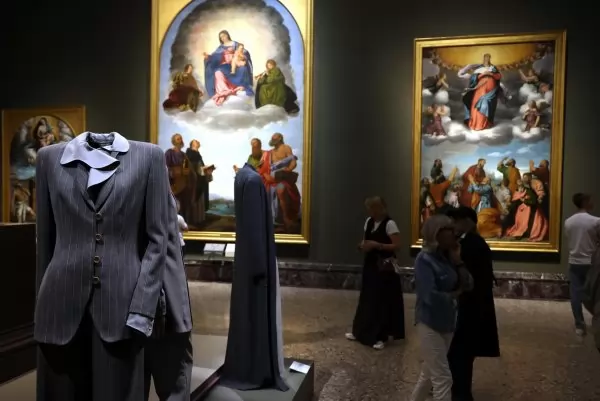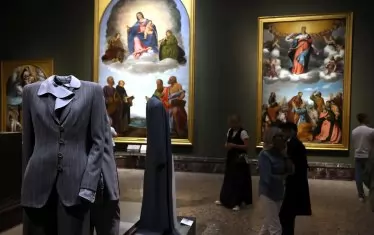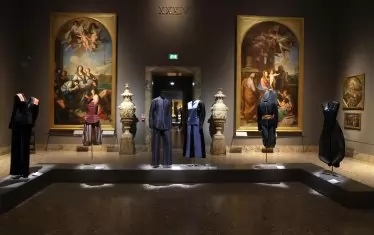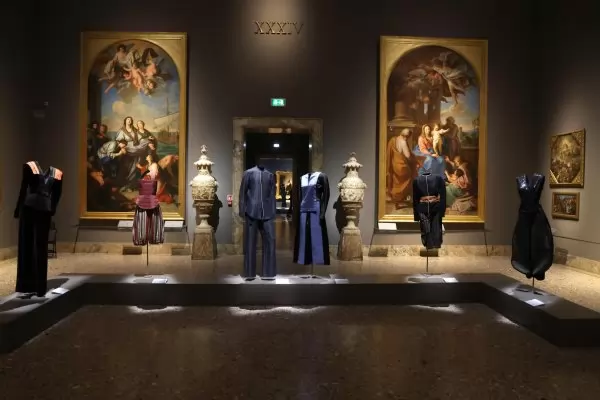 В една от залите пола и блуза на Армани в тъмносин цвят, носени от френската актриса Жулиет Бинош на кинофестивала в Кан през 2016 г., са изложени срещу картината "Мадона с дете" на художника Джовани Белини. Синият воал на Девата е в хармония с ансамбъла, сътворен от модния дизайнер.
