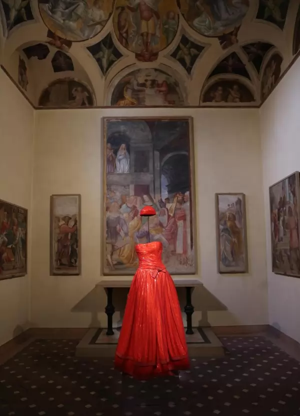 Дрехите не са изложени в определен ред, а по-скоро са подбрани така, че да са отражение на заобикалящата ги среда. Сдържаната цветова палитра на саката, ризите и бродираните панталони препраща към мраморните колони на музея. Други тоалети са по-агресивни, като бюстието от червена коприна и разкроената пола, носени от Кейти Холмс на галата на "Метрополитън" през 2008 г. Те подчертават розовите цветове на сцените от младостта на Девата, нарисувани от Бернардино Луини.