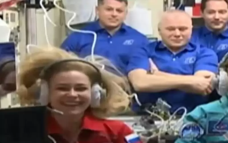 Почти веднага след като командирът на кораба, Юлия Пересилд и режисьорът на бъдещия филм Клим Шипенко най-накрая се оказаха в станцията (10 минути по-късно от планираното време), те веднага направиха връзка със Земята по телемост.
