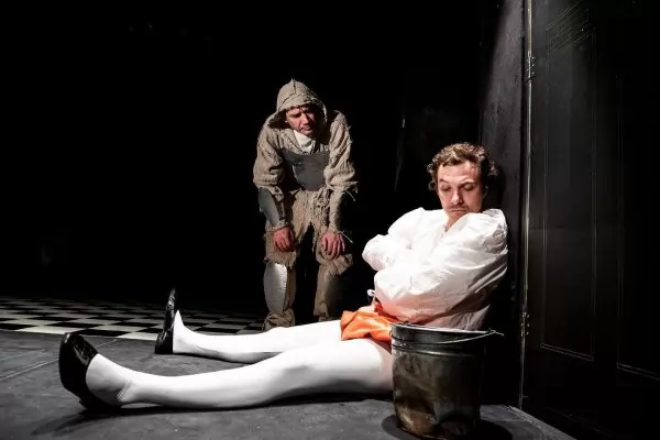 Принцесата е с шлейф, който преминава в завеса на прозореца (или завесата на прозореца преминава в шлейф, сценографията и костюмите са проектирани от художника Юлиян Табаков). Тъй или иначе, тя е закарфичена на къс повод за стената подобно на пеперуда в хербарий. Рицарят пък не е точно героичният тип от епоса – прилича по-скоро на заблуден в друг сюжет Дон Кихот с иронично пробита кофа вместо шлем на главата (човекът на Сервантес ползваше за случая легенче за бръснене). Но дори и такъв, той би могъл да предложи доста опции на красавицата, ако тя не би била упорито вкопчена в общоприетите представи за достойната партия. А портите на кулата пред принца са „заключени“ навярно само в неговата глава, защото просто се отварят навън, а не навътре, както той демонстративно се опитва да проникне. И ето го пак страха да сме щастливи, да се открием взаимно, да се втурнем в света на другите. Ако го направим, то ще е само в сънищата наяве, в мечтите, когато вече всичко друго може да е изгубено…