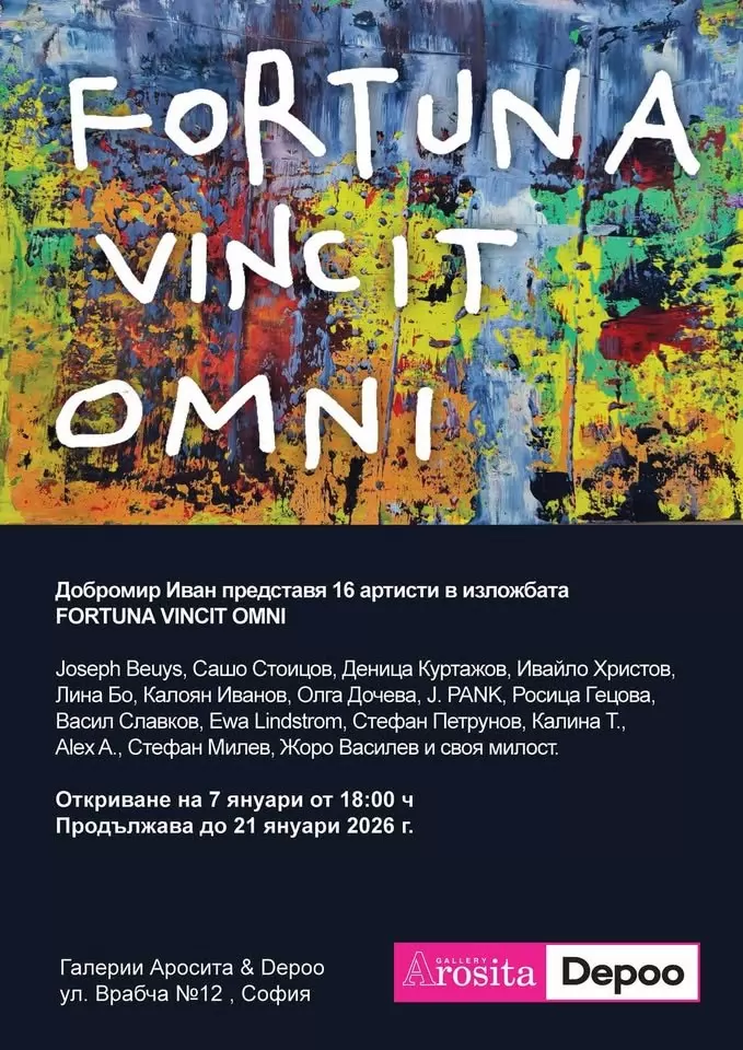 Художникът, скулптор и куратор Добромир Иван представя 16 артисти в изложбата FORTUNA VINCIT OMNI ("Късметът/Съдбата побеждава всичко" – лат.), която се открива на 7 януари от 18.00 часа в столичните галерии "Аросита" & Depoo на ул. "Врабча" 12. В селекцията Добромир Иван е включил работи на своя легендарен учител, германския скулптор Йозеф Бойс (1921-1986) – един от най-влиятелните творци на ХХ век, за чийто последен възпитаник се смята българинът. Останалите имена в експозицията са Сашо Стоицов, Деница Куртажов, Ивайло Христов, Лина Бо, Калоян Иванов, Олга Дочева, J. PANK, Росица Гецова, Васил Славков, Ewa Lindstrom, Стефан Петрунов, Калина Т., Alex A., Стефан Милев, Жоро Василев и самият Добромир Иван.