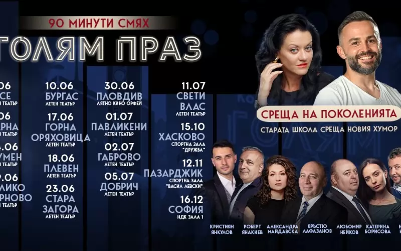 След есенните дати в Хасково (15 октомври) и Пазарджик (12 ноември), „Голям праз“ се насочва към своята кулминация. Финалът на турнето ще бъде на 16 декември в зала 1 на НДК – сцена, която отговаря на мащаба и енергията на проекта. Това няма да бъде просто заключително представление, а естествен връх на една година, преминала в щастливи срещи с публиката из цялата страна. „Голям праз“ не следва готови формули и не се повтаря – шоуто разчита на живия импулс, на реакциите в залата и на онова споделено усещане, което се ражда само тук и сега, отбелязват организаторите.