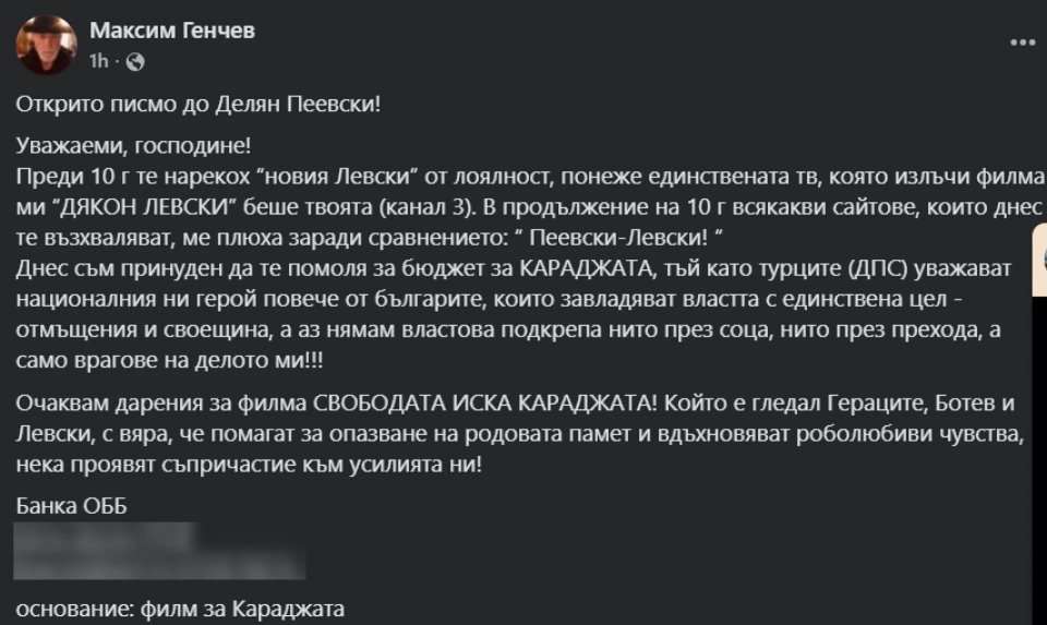 Максим Генчев, режисьорът на противоречивите исторически филми "Левски" и "Ботев", чието публично поведение буди още по-голямо недоумение, преди два дни влезе в новините със своето "Открито писмо до Делян Пеевски". В него той му напомня, че преди 10 години го е нарекъл новия Левски, защото единствената телевизия, излъчила филма "Левски", е неговата (Канал 3). Сега Генчев моли лидера на ДПС - НН за пари за следващия си проект "Караджата", защото "турците (ДПС) уважават националния ни герой повече от българите".