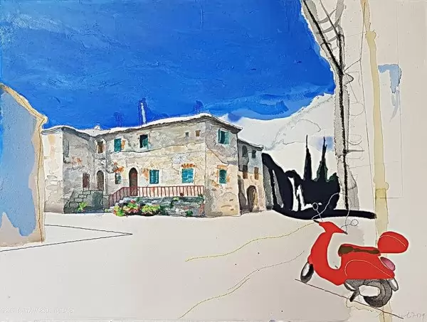 "Църквата Сан Агустино в Сан Джиминяно“ има акварелно разлято синьо небе, акрилни сгради по слънчевия площад и кобалтовосиня маслена сянка, която покрива част от паркинга. Най-интересни са обаче двете прозрачни фигури — на свети Августин, който храни няколко птици и една недовършена жена до него. Те не са нарисувани, те са избродирани с черен конец върху хартията.