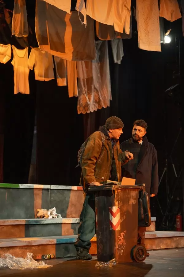 Първоначално двамата ще се спречкат за леглото от картони, за едно палто и за едно много лично писмо. Постепенно ще разтопят ледовете и ще се разкрият един пред друг. Вишневски – педантичният многознайко, прекършен от живота, но продължаващ да се отнася към хората с уважение и доверие, и Тони – типичният „грубиян“ със златно сърце, но позлатено чак след загубата на любов и статус… Кой точно е той и защо е на улицата ще стане ясно едва накрая. Образът на експресивния Тони лепва като ръкавица на Юлиан Вергов, Петър Антонов е привидно по-скован според мярката на своя персонаж, а в хода на действието двамата ще стигнат до не един и два истински съкровени мигове като човешки тандем, озовал се в обща житейска пропаст. Ще стигнат и до извода, че свободата е за споделяне. И всеки в крайна сметка ще помогне на другия – да живее или да пък да умре, преоткрил смисъла.