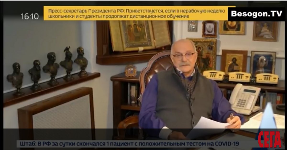 От 2014 г. Михалков е автор и водещ на откровено пропагандистката програма „Бесогон ТВ” по федералния тв канал „Россия 24”. В последното издание на предаването си, озаглавено „Ну, вот и всё”, водещият, заобиколен от бюстове на руски императори, пълководци и политици от царска Русия, десетина икони и 4 телефона, бе посветил на Европа, коронавируса, либералите и демокрацията. Предлагаме ви няколко цитата: