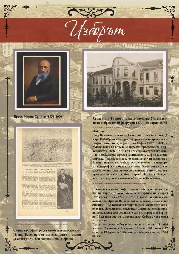 Изложен е рядък екземпляр от личната библиотека на д-р Константин Стоилов с дневниците на Учредителното събрание в Търново от 1879 г., в които е публикувано заседанието от 22 март с обсъждането и избора на София за столица на България. Други издания са посветени на градоустройството: „Стара София. Първият регулационен план на София от 1879 г.“ от Радослав Михайлов (1941); „Изграждане на бъдеща голяма София: Какво предвижда планът Мусман“ (1938); статия „Извлечение из обяснителния доклад на проф. Мусман“ от сп. „Сердика“ (1938).