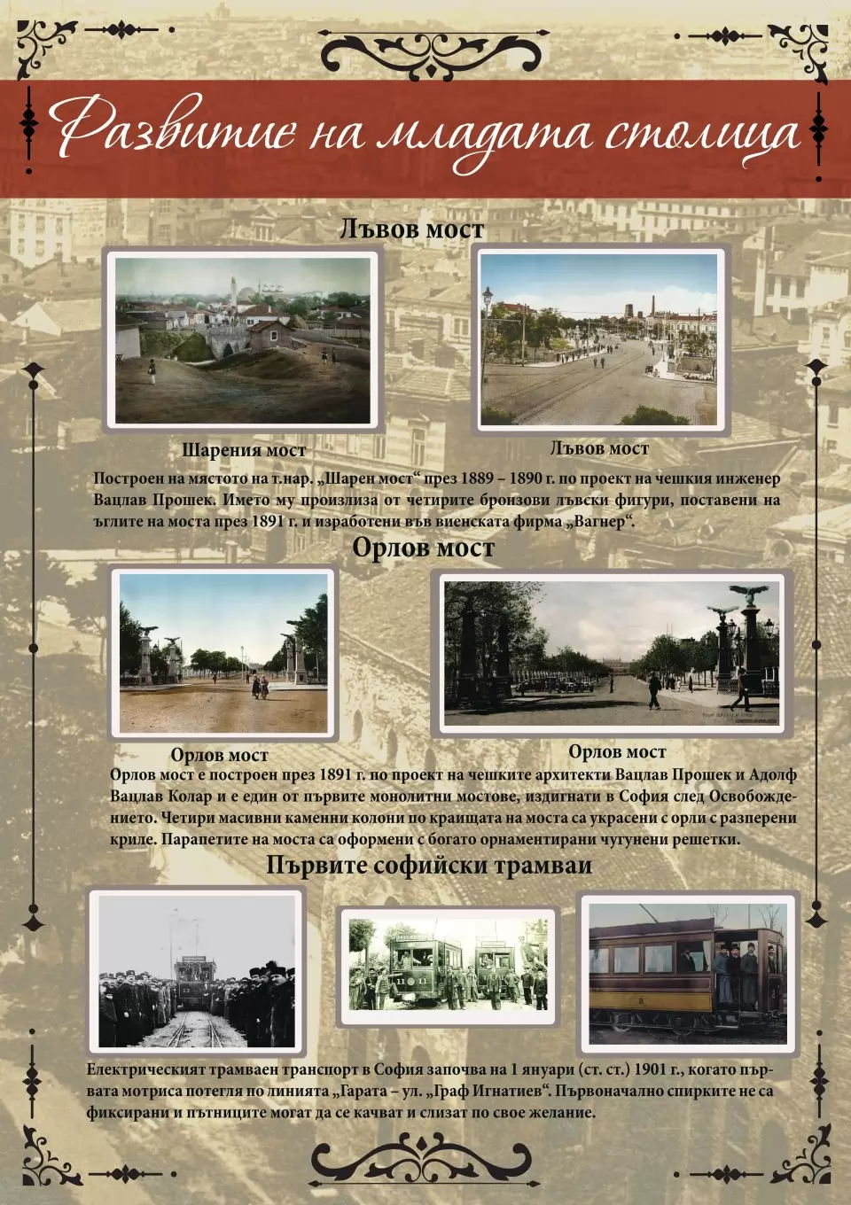 Постерите в експозицията включват множество емблематични изгледи от София, снимки и информация за култови места и сгради, историята на създаване на герба на столицата. Селекцията проследява и сформирането на Столична голяма община с присъединяването през 1938 г. на близките до големия град села Бояна, Княжево, Горна Баня, Надежда, Слатина, Драгалевци и Дървеница.