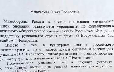 „В рамките на специалната военна операция се предприемат мерки за формиране на положително обществено мнение на гражданите на Руската федерация в подкрепа на ръководството на страната и действията на въоръжените сили на Руската федерация, предприети от ръководството на страната — пише Шойгу. — Едновременно с това в културния сектор на руското медийно пространство продължават да се показват филми и телевизионни предавания с участието на В. А. Зеленски, а също и реализирани творческите проекти на крупния украински медиа мениджър А. Е. Роднянски. Популяризирането на тези лица (Зеленски и Роднянски - ред.) в настоящите условия не допринася за изпълнението на решенията, взети от ръководството на страната“.