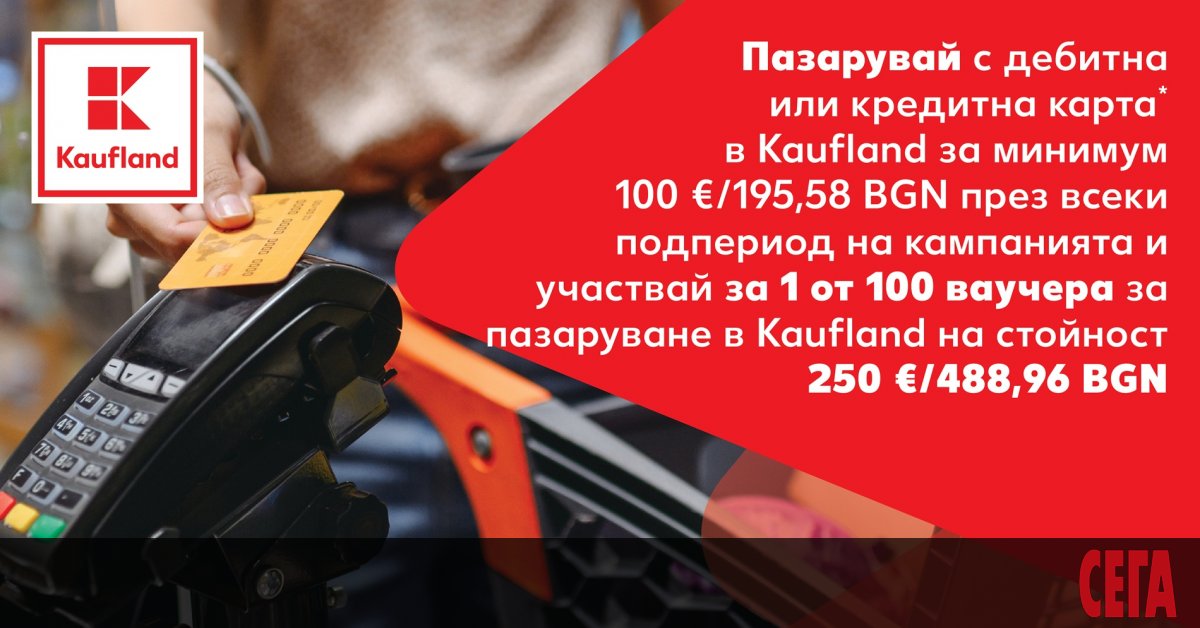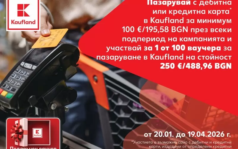 София, 20 януари 2026 г. – Kaufland стартира нова кампания, която насърчава картовите разплащания при пазаруване и дава шанс на клиентите да спечелят ваучери за пазаруване, всеки на стойност 250 евро (488,96 лева). В периода от 20 януари до 19 април 2026 г. всеки клиент, който извърши една или повече покупки в магазин на веригата на обща стойност минимум 100 евро (195,58 лв.) през поне един от периодите на кампанията и заплати с една и съща дебитна или кредитна карта, или с ваучер за храна на електронен носител, издадени от партнираща банка*, може да участва в играта. Участието е възможно неограничен брой пъти.