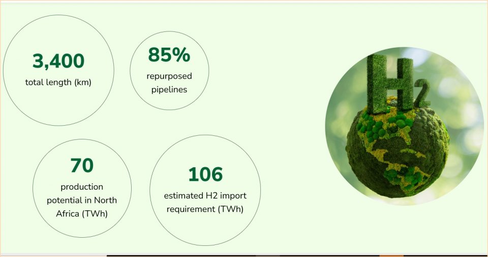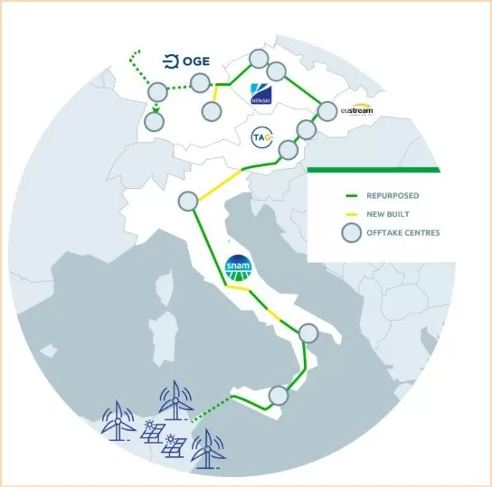 SunsHyne Corridor ще свърже хъбовете за производство на водород в Северна Африка – с потенциал за внос приблизително 450 GWh на ден – с райони с високо търсене по маршрута, особено в Южна и Североизточна Германия, където се очаква търсенето през 2030 г. да надхвърли 100 TWh.
