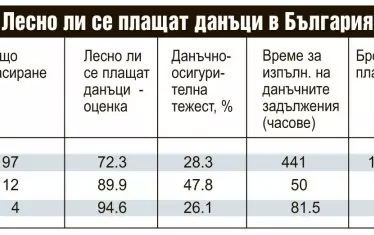 И за сведение на управляващите България не е с най-ниски данъци. Бремето на плащанията, което включва подоходните налози, ДДС, акцизите, осигуровките, екоданъци и др., у нас е 28.4%, а в Румъния е само 20 на сто, сочи глобалното проучване. А има и още по-добър резултат - в Грузия данъчно-осигурителната тежест е едва 9.9% (не е чудно, че в класацията тя заема 14-о място).