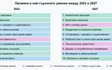 Христова предлага сравнение и с прогнозата за десетте умения, които ще са най-търсени към 2027 г., която е разработена на базата на инициативите на работодателите за развитие на работната сила (данните са от глобално проучване на Световния икономически форум сред фирми от 27 икономически сектора в 45 държави). Аналитичното и креативното мислене остават стабилни на върха, като директно на трето място се подрежда "Изкуствен интелект и големи данни" - ново умение, което според нея е ярък индикатор за посоката, в която се развива глобалната икономика. Социалните умения се преподреждат, но запазват своята фундаментална значимост. Мотивацията (на 9-то място), любопитството (на 6-то място) и уменията за непрекъснато учене трайно се налагат като много важни.