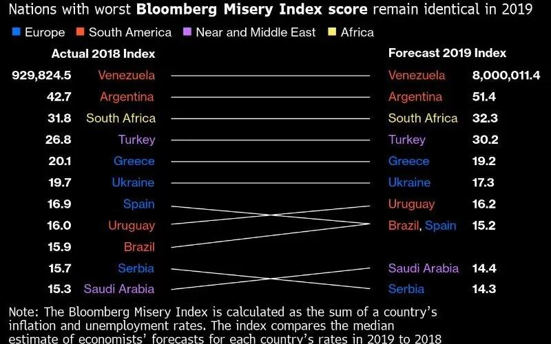 Заедно с Венецуела към най-затруднените страни са Аржентина, Южна Африка, Турция, Гърция и Украйна - всяка, от които запазва същия ранг като миналата година, показвайки силен икономически стрес и оскъден напредък в укротяването на цените и връщането на хората на работа.
