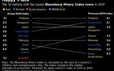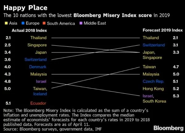 Индексът на Bloomberg разчита на вековната концепция, че ниската инфлация и безработицата обикновено илюстрират колко добре трябва да се чувстват жителите на икономиката. Резултатите за тази година се основават на проучванията на Bloomberg, докато предишните години отразяваха статистически данни.