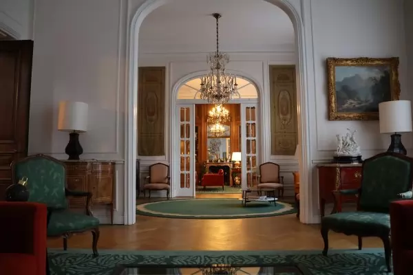 Пищният бароков интериор на къщата трябвало да отразява професионалните успехи и богатството на банкера. Спомен от онова време са оригиналните дървени ламперии от кестен, запазени са и камините. През 1936 г. Франция придобива сградата за нуждите на дипломатическата си легация. От една страна това послужило за заздравяване на дипломатическите отношенията между България и Франция, а от друга мястото е близо до повечето институции в столицата и най-вече до старата сграда на Народното събрание. Трябва да се спомене, че всички произведения на изкуството в залите са собственост на френската държава и ако трябва да им се направи реставрация или поддръжка, това може да стане единствено там, защото принадлежат към инвентар, които се намира в Париж. Картините и порцелановите скулптури се въртят на ротационен принцип и не след дълго в София ще пристигнат други от някоя френска резиденция по света. Това става след внимателно обсъждане и инвенатризиране на интериора. Не се позволяват своеволия.