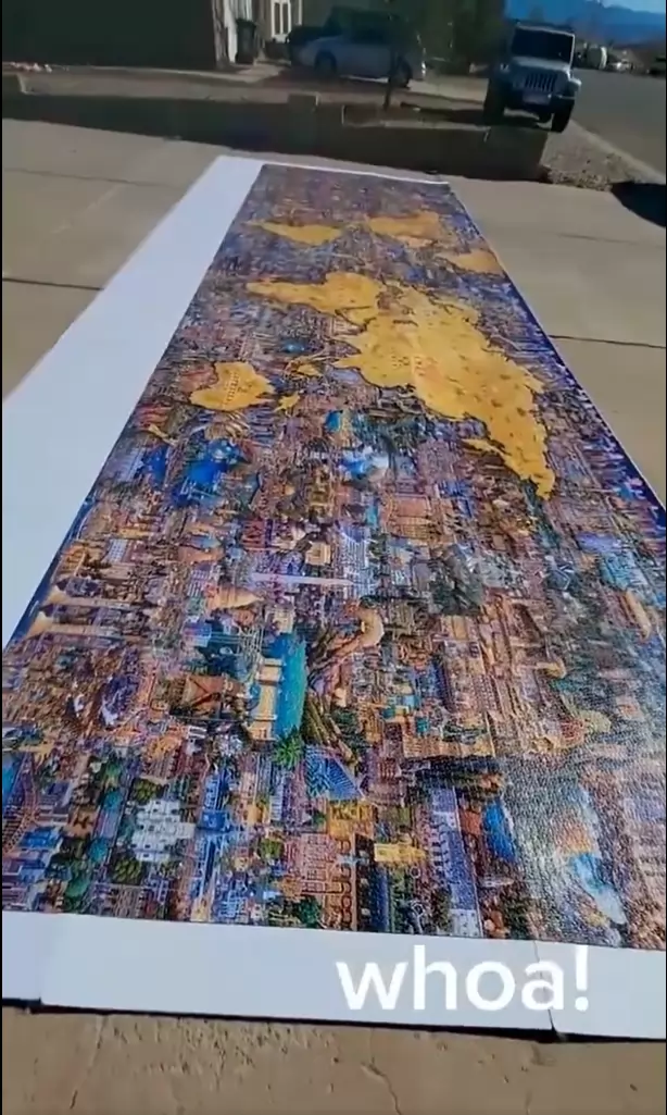 Сглобеният пъзел, изобразяващ седемте континента и стотици чудеса на света, е заел практически цял гараж, в който се побират три автомобила.