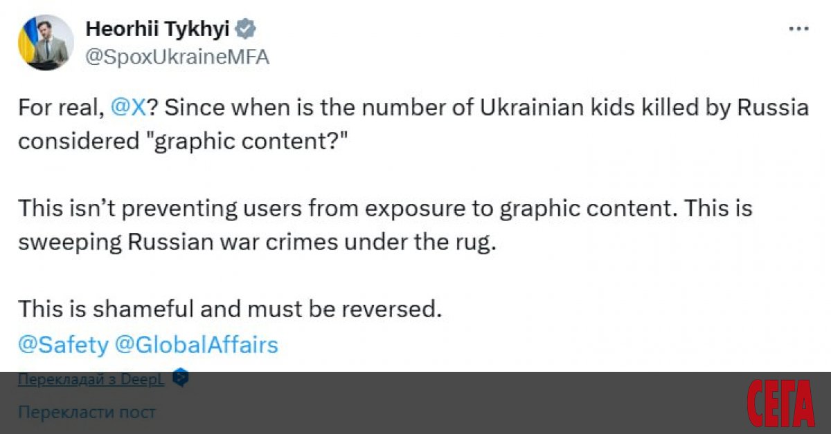 "Наистина ли, X? Откога броят на убитите от Русия украински деца се смята за "шокиращо съдържание"? Това не е защита на потребителите от жестоки изображения. Това е премълчаване на военните престъпления на Русия. Това е позорно и това решение трябва да бъде отменено", написа в X представителят на украинското МВнР Георгий Тихий.