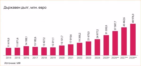 "Да, към момента България все още е със сравнително нисък публичен дълг – прогнозата е за 27,8% от БВП към края на годината. Но траекторията сочи рязко нарастване – от 23.1% спрямо БВП през 2024 г. до 36.6% от БВП през 2028 г. Това прави увеличение с 25 милиарда евро само за 4 години. Това е при сбъдване на доста оптимистичната прогноза за размера на дефицита, а при по-голям дефицит увеличението ще е още по-плашещо. Отделно трябва да добавим очаквано издаване на държавни гаранции в размер на още около 3% от БВП", посочва Богданов. И изтъква, че България поддържаше ниски нива на дълга в продължение на четвърт век, защото спазваше бюджетната дисциплина - средното бюджетно салдо за периода 1998-2019 г. беше нула. Дори ако добавим периода след Ковид, средното ниво на дефицита за последния четвърт век е 0,5% от БВП, далеч под стойностите, към които води сегашната фискална политика.