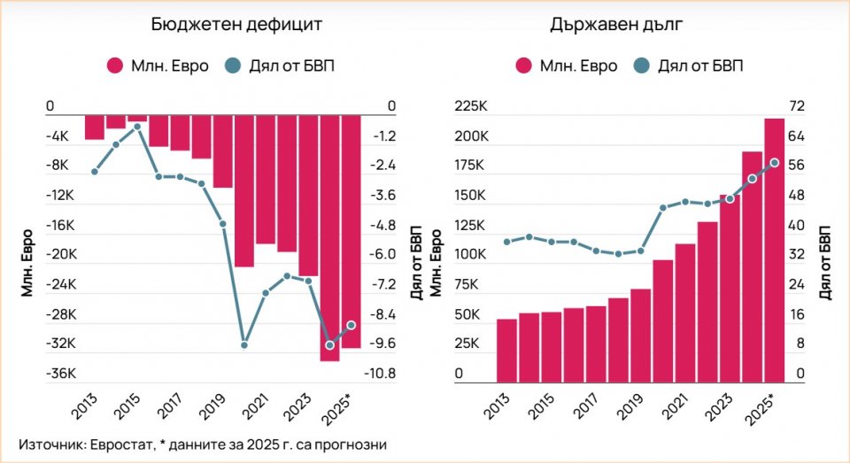 Също като в България тази щедрост не е съчетана с повишени приходи. Бюджетният дефицит започва да се разширява още в предкризисните години, като през 2019 г. надхвърля 4% от БВП. А през 2020 г. заради ковид пандемията превишението на разходите над приходите достига 9 процента. В номинално изражение „дупката“ в бюджета нараства главоломно - от 837 млн. евро през 2015 г. до над 33 млрд. евро през 2024 г. Дефицитът се финансира за сметка на нов публичен дълг – от под 60 млрд. евро в средата на миналото десетилетие до над 193 млрд. през 2024 г. и прогноза за над 220 млрд. евро през настоящата. Дефицитът отдавна не се вписва в европейското фискално правило от под 3% от БВП, а вероятно догодина и дългът ще надхвърли допустимия праг от 60%. Бързият икономически растеж е отдавна в миналото – през 2023 г. ръстът на БВП се забавя до 2.3%, през 2024 г. – до 0.9%, а за тази година прогнозата на ЕК е за растеж от едва 1.4%.