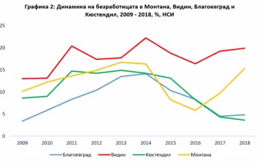 през 2018 г., в Монтана и Видин тя остава двуцифрена с тенденция към влошаване през последната година. Южните области до голяма степен успяват да се възползват от възстановяването след кризата и подобряват условията на трудовите си пазари, но това не важи за северните.