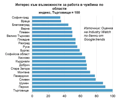 Регионалната динамика на трудовите доходи зависи както от активността в реалната икономика, така и от гъвкавостта на предлагането на труд по линия на включването на неактивни лица в работната сила и вътрешната миграция от съседни по-малки населени места. Възможностите за намиране на препитание в други европейски страни също оказват силно влияние на пазара на труда - като създават трудности на фирмите в намирането на необходимия персонал и като дърпат нагоре заплатите. Трябва да се отбележи, че интересът към работа в чужбина варира значително по области. Така например софиянци са най-малко склонни да търсят препитание зад граница, докато обитателите на Търговище, Перник, Шумен масово имат нагласа да опитат живота на гастарбайтера. Това, че все повече българи намират реализация на европейския трудов пазар, се вижда много ясно в статистиката - парите, които емигрантите са пратили у нас миналата година, са 1.953 млрд. евро, а това е с 30% повече, отколкото през 2016 г.
