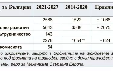 При тази рамка страната ни получава 108% финансиране по трите фонда - Кохезионен, Социален и Регионален, спрямо 2014-2020 г. Увеличението от 8% всъщност е ограничение - Европейската комисия е взела принципно решение нито една страна да не получи повече от 8% ръст в парите или повече от 24% намаление. Така страните с най-голям ръст са България, Румъния и Гърция, които получават максимално позволеното увеличение от 8%. 5 държави се ползват от другата предпазна мярка - за не повече от 24% намаление на парите - Унгария, Литва, Естония, Малта и Чехия биха загубили още повече финансиране, ако не съществуваше това ограничение.