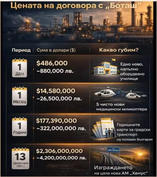 "Булгаргаз“ получава достъп до терминалите за втечнен газ и газопреносната мрежа на Турция. Няма значение ползва ли тази инфраструктура или не, начисляват му се фиксирани такси - около 500 000 долара на ден. Договорът е за 13 години, което прави над 4 милиарда лева за целия му срок. Без да се броят предвидените индексации и лихва за забава. Договорът е подготвен и подписан в невиждано експресна процедура и не от редовен, а от служебен кабинет. Без клаузи за разваляне. С жестоки неустойки.