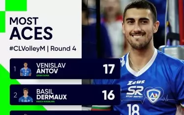 Български волейболист приключи груповата фаза на Шампионската лига като лидер в една от най-престижните индивидуални класации - за най-много отбелязани точки директно от сервис. Диагоналът на "Левски София" Венислав Антов е №1 по този показател със своите 17 аса в шест мача.